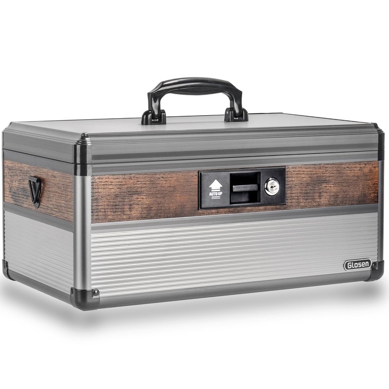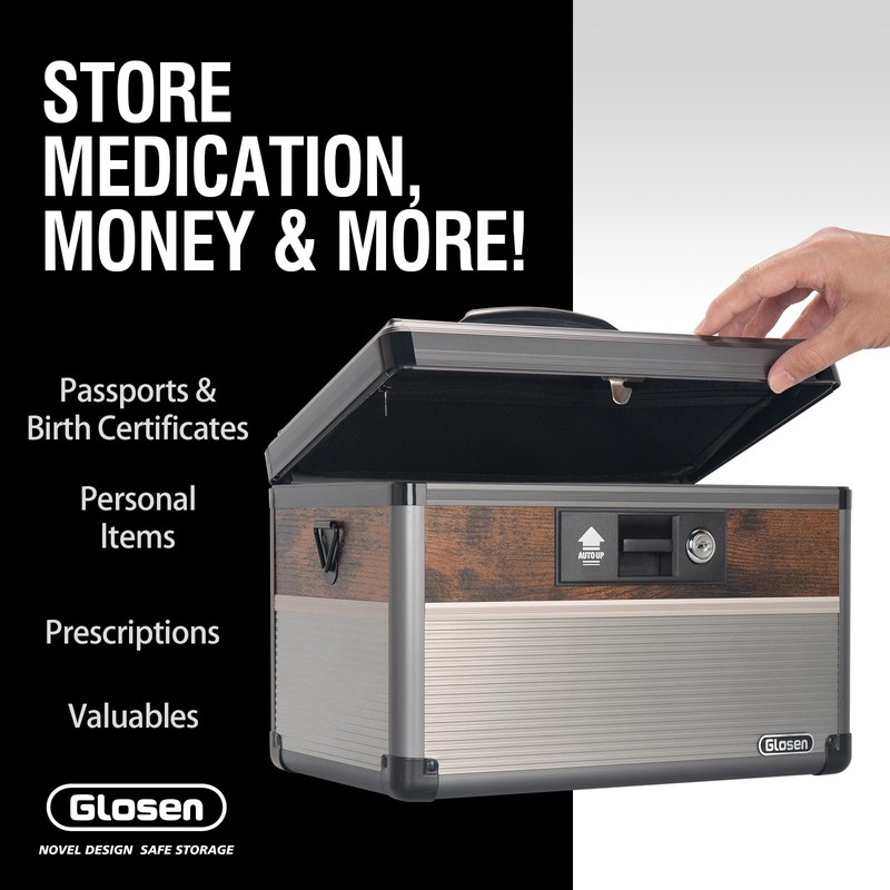 - Glosen Medicine Lock Box materials:the lock box is Made of aluminum alloy + MDF with keys to keep your medications safe, good corrosion resistance, sturdy body and better metal feel