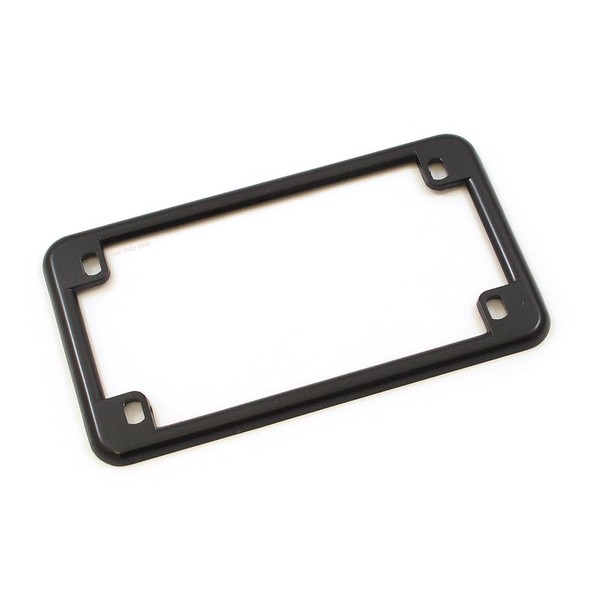 Gloss black metal motorcycle license plate frame. This is a universal license plate frame. Use it on any motorcycle, scooter or moped license plate for a clean look.
