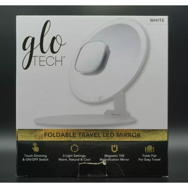 GloTech Foldable Travel LED Mirror, White Opened Box
