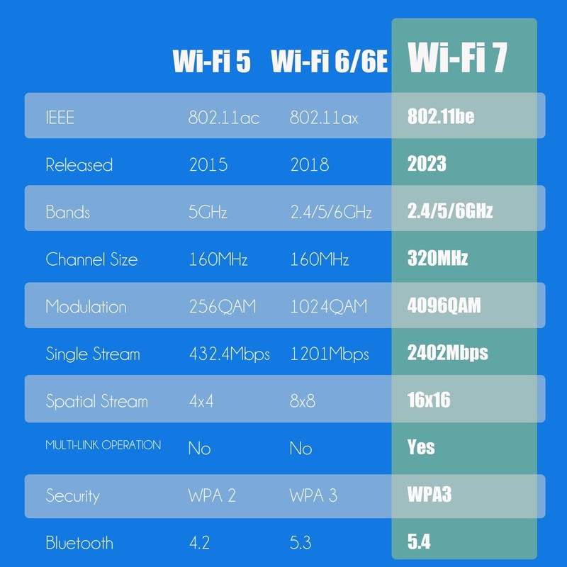 - Operación multienlace (MLO): permite a los dispositivos Wi-Fi 7 establecer múltiples enlaces (bandas de 2,4 GHz 5 GHz y 6 GHz) simultáneamente en comparación con un solo enlace (banda de 2,4 GHz o 5 GHz o 6 GHz) en generaciones anteriores de Wi-Fi