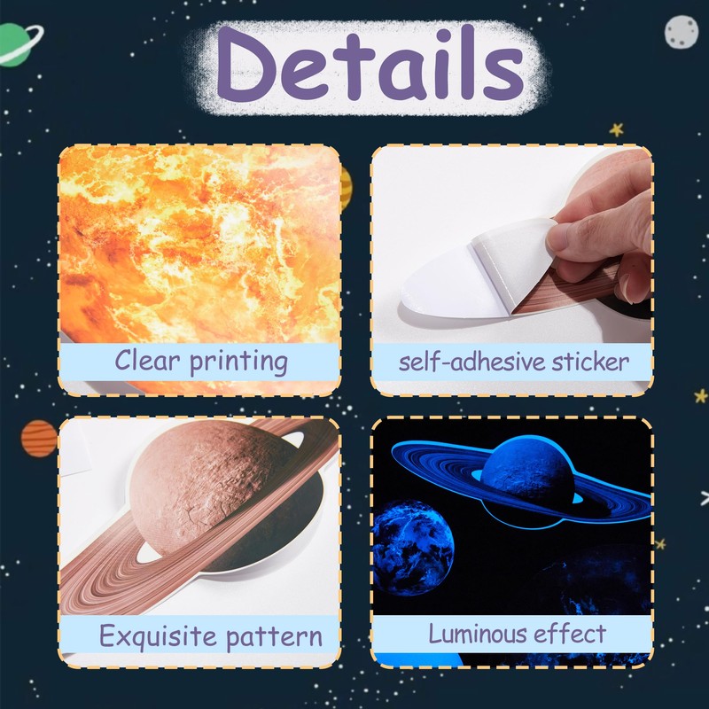 - 【Glow in the Dark Stars】Robmoda glow in the dark stickers including 132 pcs stars, 662 pcs dots, 9 pcs solar system planets and 10 pcs of other patterns, including astronauts, flying saucers, spacecraft, rockets, meteorites, aliens. The sun size is 9.45*9.45 inchs, these decals enough to cover the whole ceiling of your kids’ room, in the dark the room become to starry shiny bedroom.