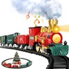 - Christmas Train Set Around Christmas Tree - The classic style electric Christmas train toy comes with a classic steam locomotive, passenger car, coal car, freight car, 10 curved tracks, 4 straight tracks, and a water bottle. Train locomotive engine requires 4x1.5V AA batteries (not included). Track Layout Dimensions: 55’’ (L) x 35’’ (W). Kids will turn on the railway set and get ready to embark on a pleasant journey to play with their endless imagination.