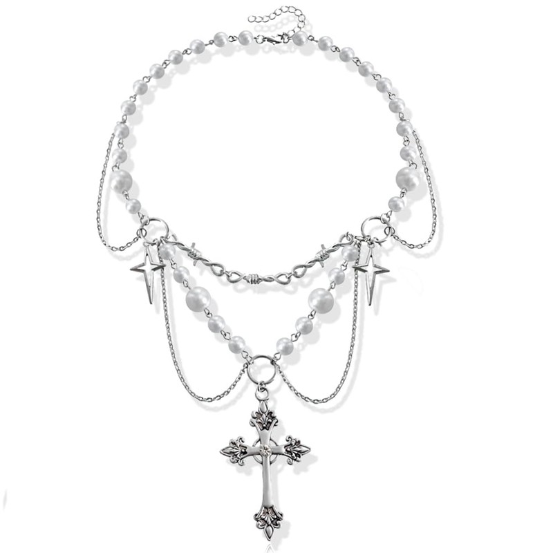 Glowjoy Crystal Cross Pearl Halskette, Statement-Halskette mit gotischem Kreuz und Perlen für Damen, Silber Perlen Schmuck für Frauen und Mädchen, Beste Freundin Geburtstag Jahrestag Schmuck