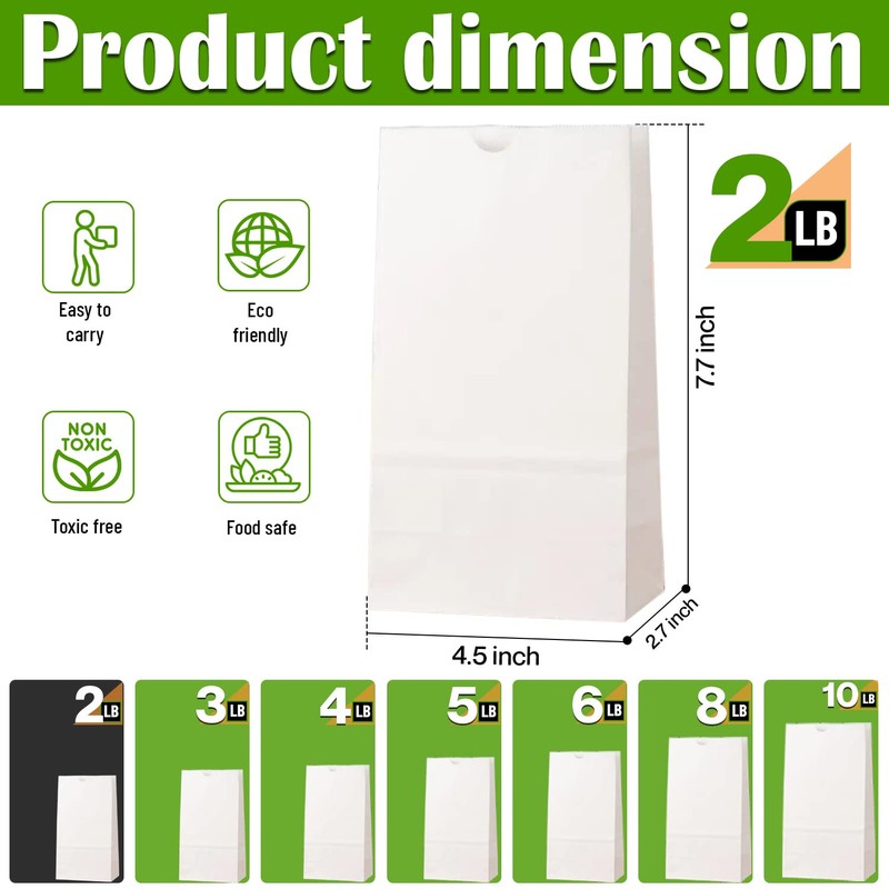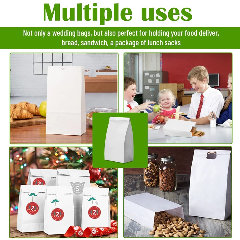 - Set of 100 white paper bags / Each bag measures 8.5 x 5.25 x 3.5 inches