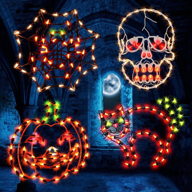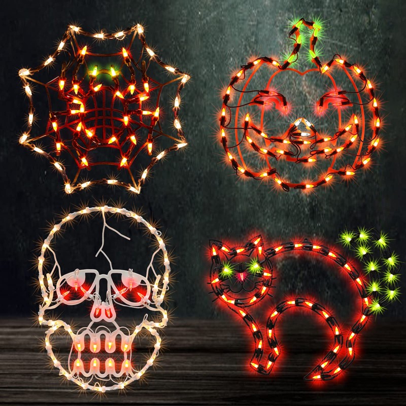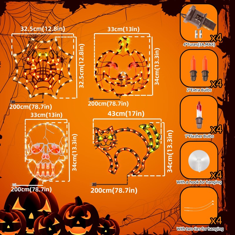 • HALLOWEEN DECORATIONS: You will get four Halloween LED window lights ( Jack-O-Lantern , Cobwet ,Skull, Cat ) , and they come with 4 pcs suction cups and eight ties. Our Halloween themed window lights are ideal for Halloween decoration.