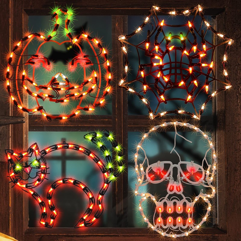 GLOWNOVA 4 Pack Lighted Halloween Window Silhouette Decoration,Jack-O-Lantern, Cobwet,Skull, Cat, Lighted Window Decoration