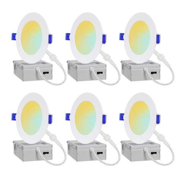 GLOWNOVA 6-Pack of 4-Inch Ultra-Slim LED Downlights with Junction Box, Adjustable Color Temperatures (2700K-5000K), 9W EQV to 75W, Dimmable, 950LM Luminance - ETL and Energy Star Certified