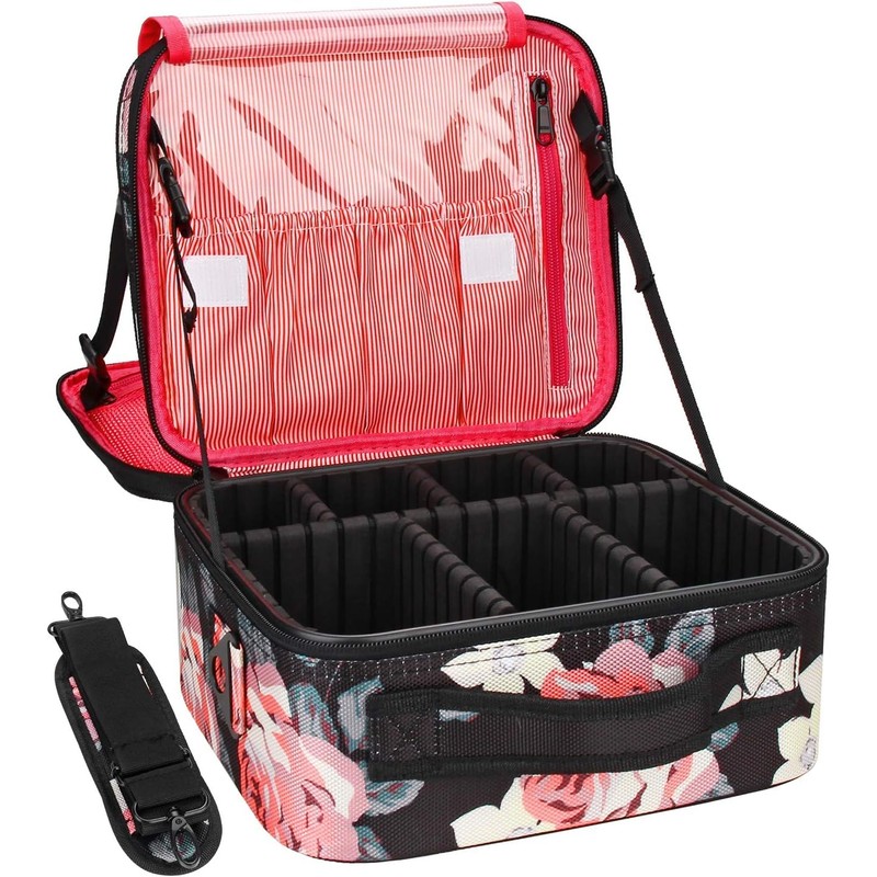 GlowPro Large Makeup Bag Makeup Organizer Cosmetic Travelling Bag with Adjustable Dividers Portable Makeup Storage Bags for Professionals with Covered Makeup Brushes Section (Peony Patter)