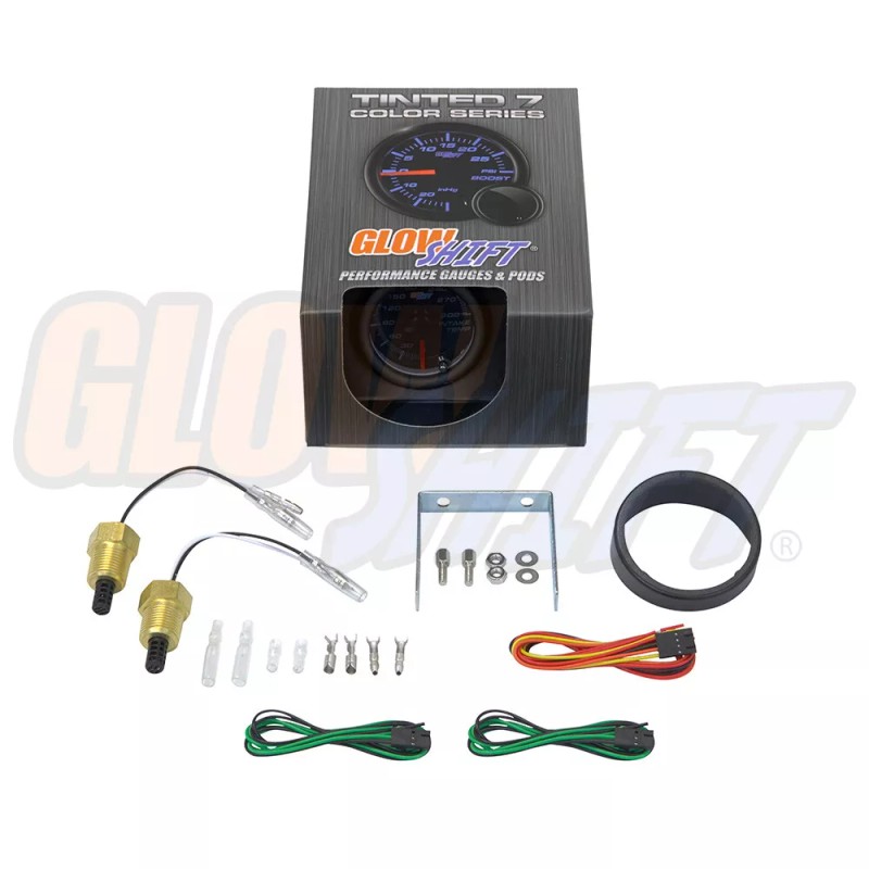 GlowShifts Tinted 7 Color Series Dual Intake Temperature Gauge enables you to monitor the efficiency of your vehicles intercooler system with two independent analog needles that read from 0 to 300° Fahrenheit. This 2-1/16 (52mm) dual intercooler air temperature gauge will measure the hot air being forced into your intercooler and the cool air being pushed into the engine. Parts required for installation are covered with accessories including (2) temperature sensors, wiring harnesses and mounting hardware.