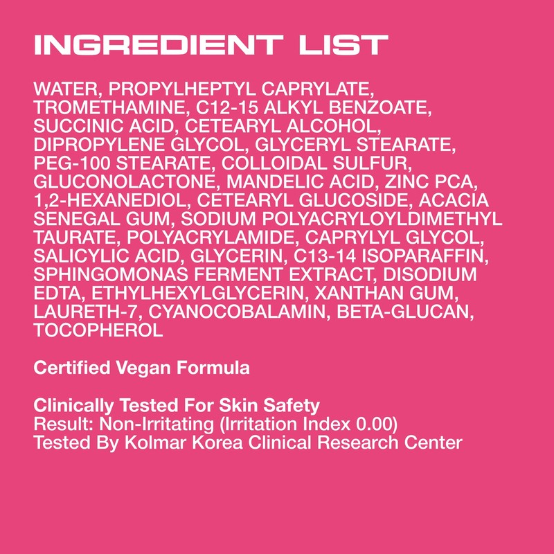 • Targets early-stage breakouts with Succinic Acid and Sulfur to reduce visible blemishes before they fully emerge.