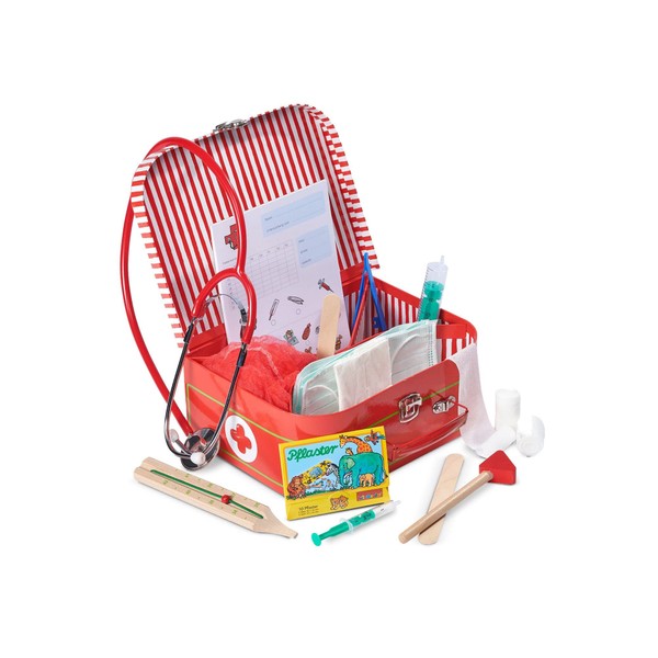 With this doctor's case and medical accessories, small doctors, nurses and nurses can examine their cuddly toys, friends and family members - and make them healthy. The case includes hoods, mouth guard and tweezers in case of surgery, a fever thermometer, syringes, plasters and bandages for small misfortunes. Especially great but the little doctors will find the real stethoscope. This actually works, because it comes from the medical specialist, but has been damped for children's ears as a precaution. In general, the extensive accessories are very realistic and therefore have a special appeal in the game. The green syringes (without needles, of course) look exactly like the doctor. The surgical caps, on the other hand, are in bright red. And with the fever thermometer, a "real" temperature can even be set by means of a ball guided on a band. All utensils are packed in a cute bright red children's case with motifs - in 4 compartments, so that everything does not get messed up during transport. So the little nurses, paramedics and doctors can quickly rush to an emergency use in the children's room or living room. Order this doctor's case for your little relatives and get a particularly high-quality product that has been made close to reality, but specifically for children.