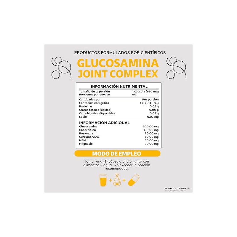 BEYOND VITAMINS - Glucosamina JOINT Complex-Contiene Glucosamina, Condroitina, MSM, Cúrcuma, Boswellia, Magnesio- 95% de Curcuminoides Estandarizados - Suplemento Vitamínico - Suplemento Alimenticio en Cápsulas - Sin Azúcar-Ingredientes NON GMO-60 cápsulas. 🏆 Reconocido por su excelente relación calidad-precio. Tecnología avanzada y rendimiento superior. 📦 Entrega rápida y segura. Ideal para quienes buscan lo mejor en calidad y estilo. Producto auténtico con satisfacción total asegurada. ¡No te quedes sin el tuyo y aprovecha esta oportunidad única!