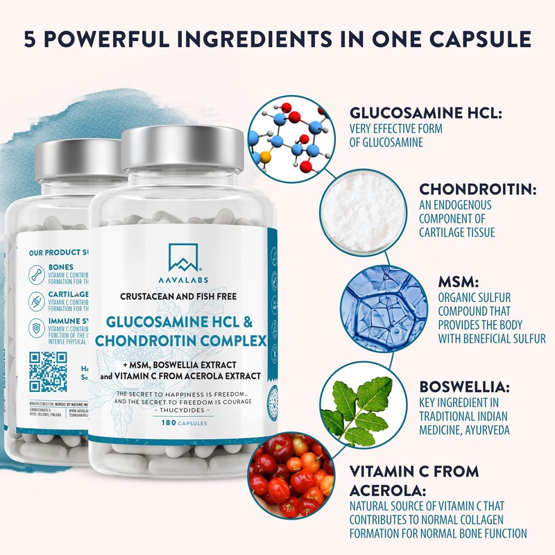 - SUPERIOR GUARANTEE: AAVALABS ensures top European quality and safety standards for our glucosamine chondroitin complex. It undergoes third-party testing in a European GMP certified facility, ensuring top quality throughout production. Our formula is free from crustacean and fish allergens, gluten, lactose, magnesium stearate, zinc oxide, and titanium dioxide. One bottle has 180 capsules for a 2-month supply, and a recommended 3 capsules per day intake is suggested for optimal health benefits.