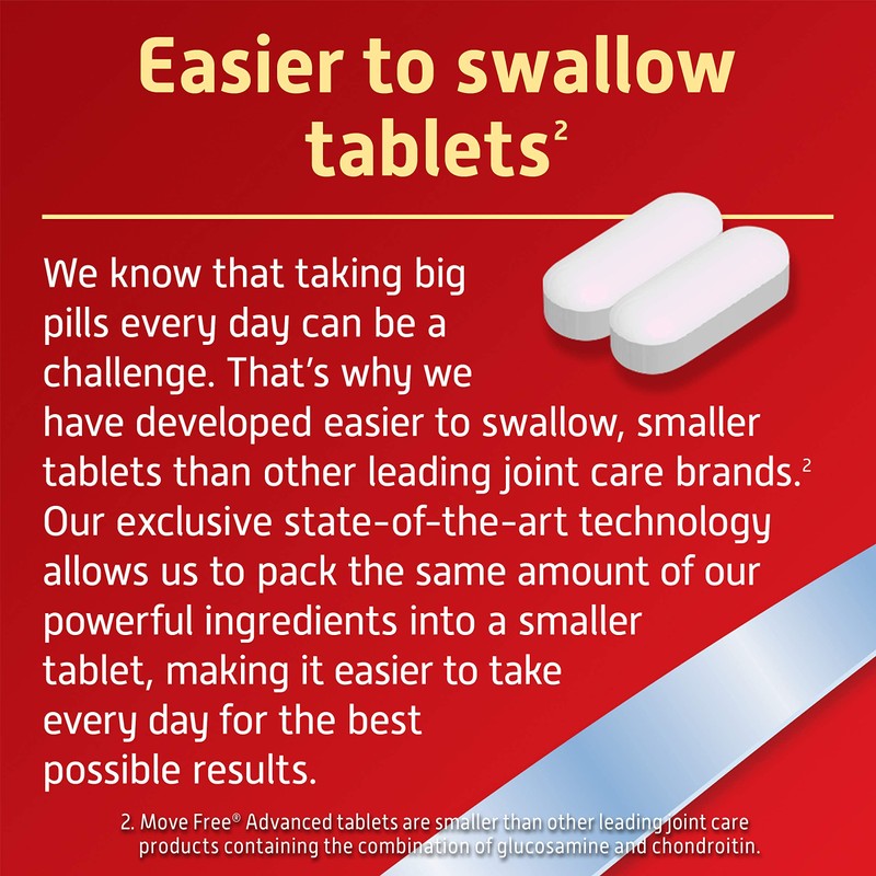 Move Free Advanced + MSM & D3 combines heritage joint support ingredients with the clinically studied mineral complex Uniflex. This formula contains Glucosamine, Chondroitin, Uniflex, HA, MSM and Vitamin D3 to help support mobility, comfort, strength, flexibility & lubrication.* PLUS it provides extra cartilage support (with MSM) and immune health & bone support (with Vitamin D3).* WHY GLUCOSAMINE: Glucosamine is key for the formation of cartilage (essential building block of joints). Glucosamine helps contribute to healthy joint fluid that supports joint lubrication & smooth movement, while also supporting joint comfort, mobility and flexibility.* WHY CHONDROITIN: Chondroitin is a building block of cartilage that supports joint strength by helping to resist compression in the joints. Chondroitin functions by attracting fluid to joints to support cushioning and lubrication.* WHY MSM: MSM is a souce of sulfur found in the body that is important in the formation of collagen in joints (collagen supports the structure of cartilage).* WHY D3: Vitamin D3 helps maintain healthy levels of Calcium & Magnesium, important minerals that support strong bones (healthy bones are key for healthy joints).* *These statements have not been evaluated by the Food and Drug Administration. This product is not intended to diagnose, treat, cure or prevent any disease.