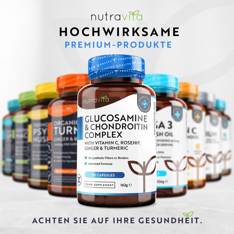 - ✔ EXCELLENT PRICE-PERFORMANCE RATIO: Each capsule of our Glucosamine and Chondroitin Complex contains an extra high dosage of 1000 mg 2KCL glucosamine sulfate, 200 mg chondroitin sulfate, 100 mg vitamin C, 50 mg turmeric powder, 36 mg 20:1 ginger extract, 4 mg 20:1 rosehip extract. The 180 capsules are enough for about 3 months, which means that Nutravita offers an excellent and better price-performance ratio than the competition with this product.