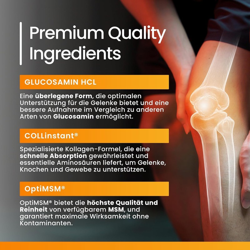 - Strong support for bones and joints: our Glucosamine Chondroitin MSM is the perfect support for your mobility. According to EFSA, zinc contributes to the preservation of bones, while manganese supports the formation of connective tissue. In addition, our formula contains antioxidants such as boswellia and selenium for a complete glucosamine chondroitin complex. Our MSM chondroitin glucosamine formula also contains high-quality COLLinstant collagen and pure OptiMSM (methylsulfonylmethane).