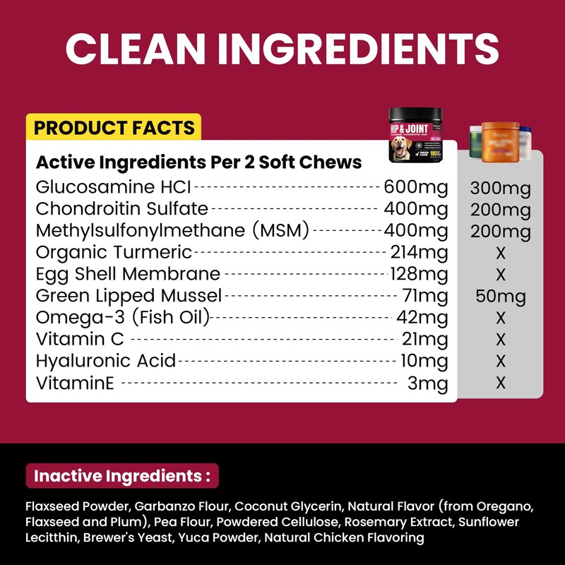Active Ingredients: Glucosamine, MSM, Chondroitin,Hyaluronic Acid, Vitamin C, Vitamin E,Alaskan Salmon Fish Oil, Green-Lipped Mussels,Tumeric,Egg Shell Membrane. Inactive Ingredients : Flaxseed Powder, Garbanzo Flour, Coconut Glycerin, Natural Flavor (from Oregano, Flaxseed and Plum), Pea Flour, Powdered Cellulose, Rosemary Extract, Sunflower Lecithin, Brewer's Yeast, Yuca Powder, Natural Chicken Flavoring