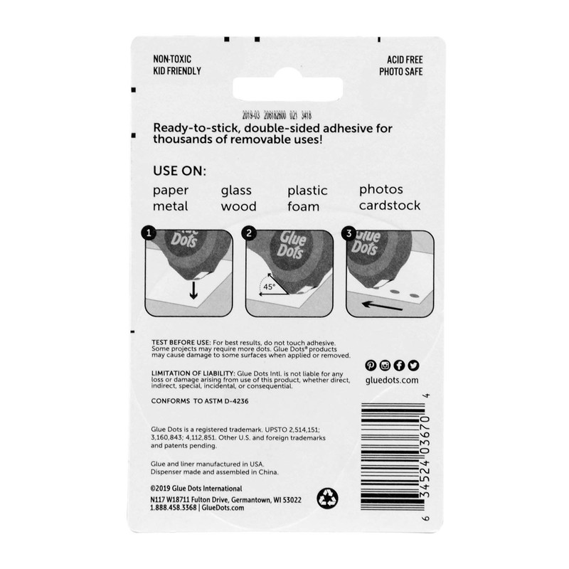 Glue Dots, the original ready-to-stick double-sided adhesive dots, are the clean and safe alternative to liquid glues, hot-melt glue guns, and tapes. They come in easy-to-use disposable applicators, rolls, and sheets. Glue Dots are also available in a wide range of temporary, permanent, and super-strength adhesive formulas that are specifically designed to make projects around your home, school, or office simpler. Our dots are easy to use regardless of age or ability, acid free, photo safe, non toxic, kid friendly, and mess free. Our dots are designed to work on a variety of materials including paper, glass, metal, plastic, wood, foam, cardstock, photos, and more. Glue Dots are the perfect adhesive solution to make your life easier.