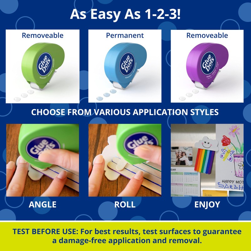 - INCLUDES: This pack comes with 3 Dot N' Go Glue Dots Dispensers; Each dispenser includes a 200-count roll of 3/8-inch permanent, poster, and removable double-sided sticky dots and provides plenty of glue for any project