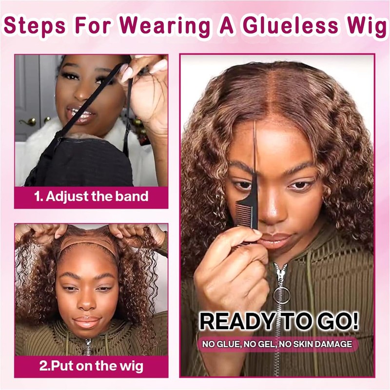 - 【Wigs Human Hair Glueless Wear and Go Material】 Glueless Deep Wave Wig Is 100% Raw Brazilian Virgin Hair,Ombre Highlight Color, Invisible Real HD Transparent Lace Closure Bob Wig,Blends Perfectly Into Your Skin. Pre Pluked Bleached Knots.No Shedding and No Tangle. Can Be Bleached, Dyed, And Straighted.