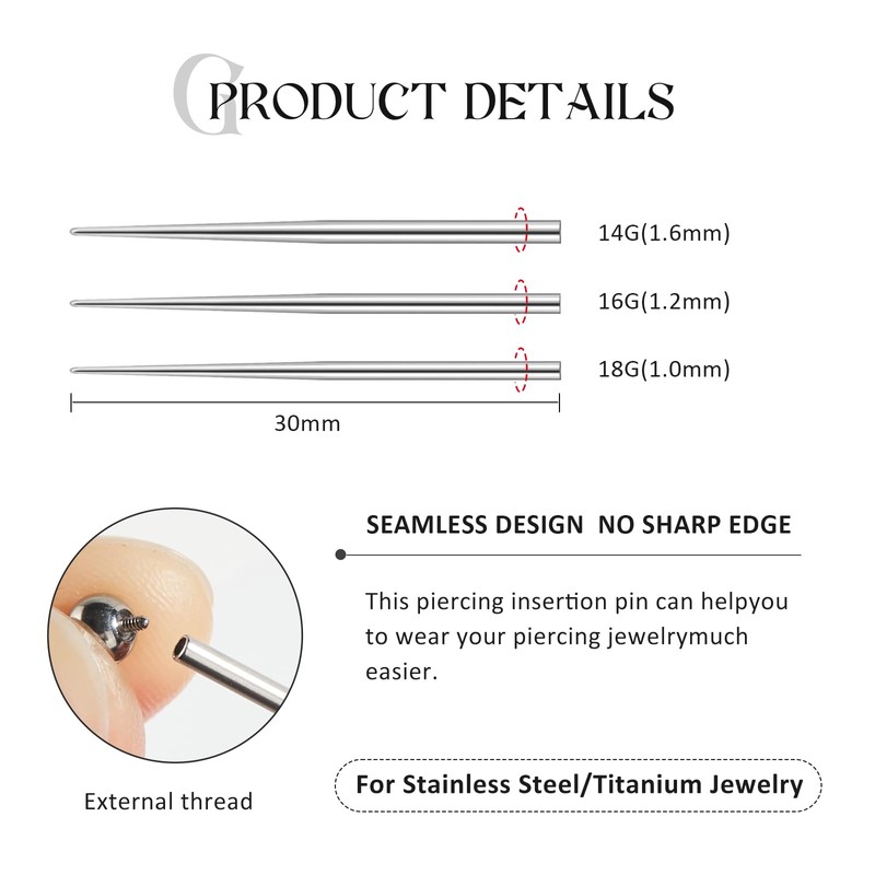 - 【Value Pack for Versatile Use】This kit contains Includes 2 each of 1mm (18G) / 1.2mm (16G) / 1.6mm (14G) unthreaded insertion taper pins. With a variety of tools suitable for different puncture wear, this value pack ensures stability, comfort, and durability, minimizing the risk of skin damage during piercing procedures.