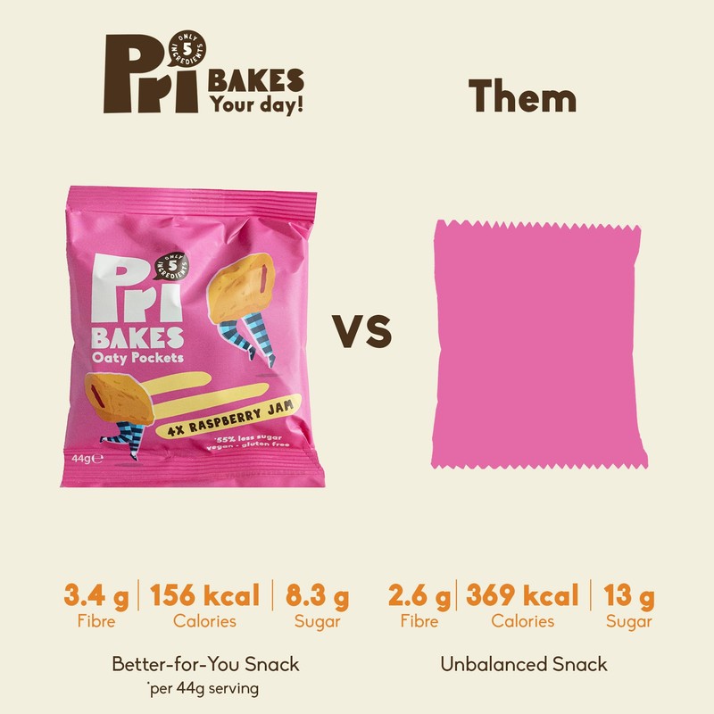 - Deliciously Simple and Natural Ingredients: All flavours of Pri Bakes Oaty Pockets are yummy and not too sweet. These sugar free snacks are made with wholesome ingredients: oats, nuts, oil, coconut sugar, dates, raspberries, hazelnut and cinnamon—low sat-fat oils and pure vegan Oaty Bakes.