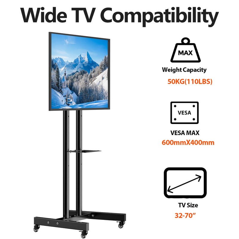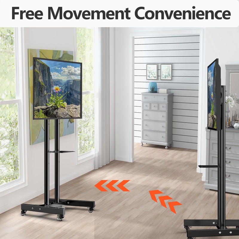 - Sturdy Flat Screen Movable TV Stand:Our tv floor stand is made of steel, sturdy and stable construction, can hold screen weight up to 50kg(110lbs), easily roll the television back and forth in home office indoor and outdoor. The locking casters are a nice plus to make the tv stand on wheels stationary when desired.