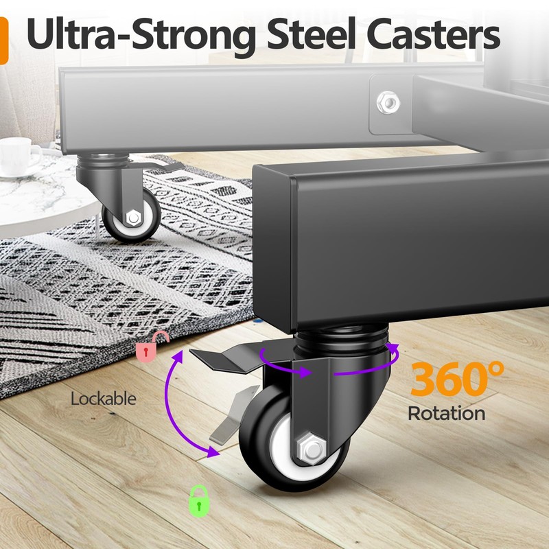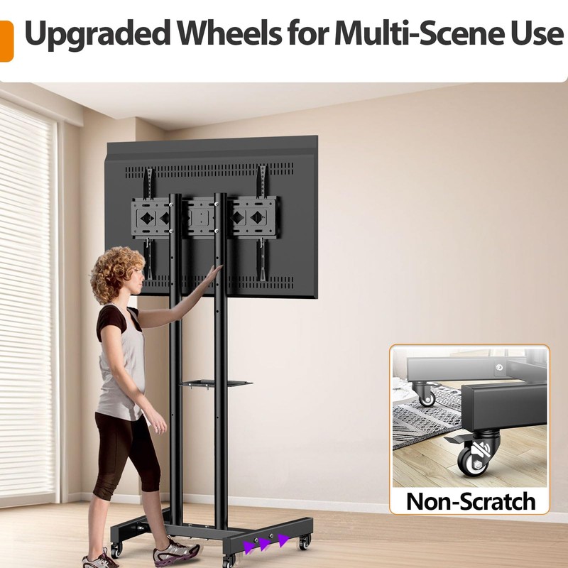 - Move Smoothly with Silent Wheels: The tv cart wheels can roll smoothly on wooden floors and carpets without worrying about frequent rolling that may damage the ground. The silent wheels minimize the noise generated during movement. You can easily move from one room to another without disturbing your family. When the tv rolling stand moves to the appropriate position, lock the wheels and you won't have to worry about someone accidentally pushing it