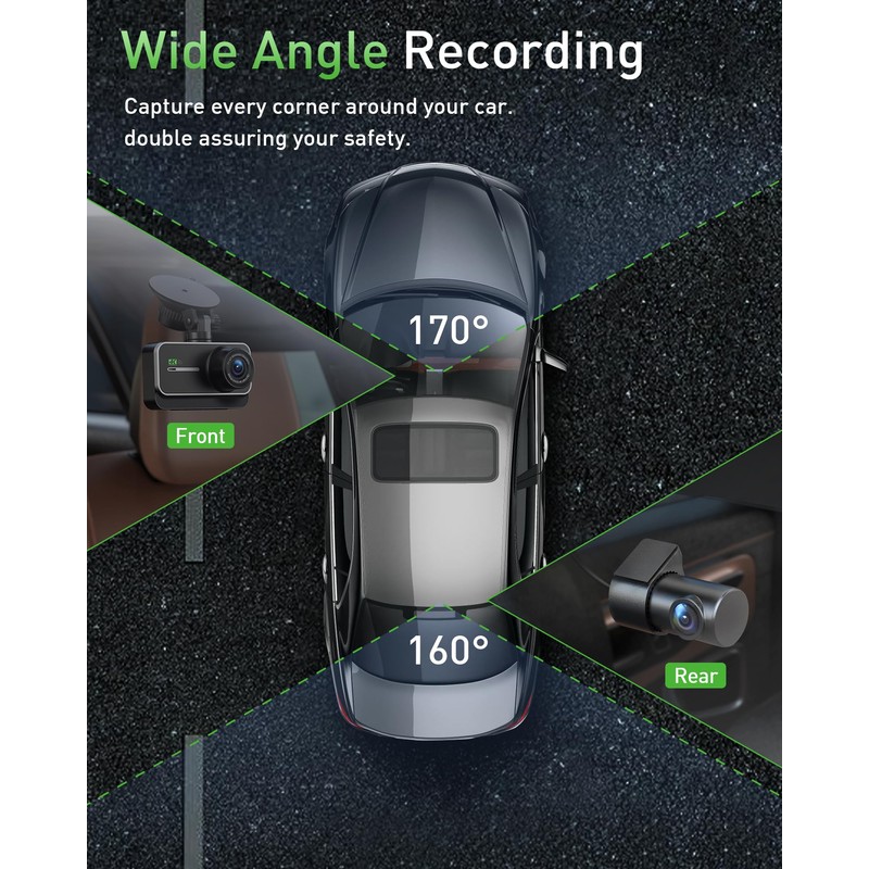 - 【Real 4K+1080P Dual Dash Cam 】Front cam - ultra 4K( 3840*2160P, 30 FPS),Rear/inside- FHD 1080P( 1920*1080P, 30 FPS),To reduce the blind areas,the front cam wide angle of 170 degree and rear cam wide angle of 160 degree. clearly capture the key details like road signs,vehicle plates...It provides the significant evidence for car accidents