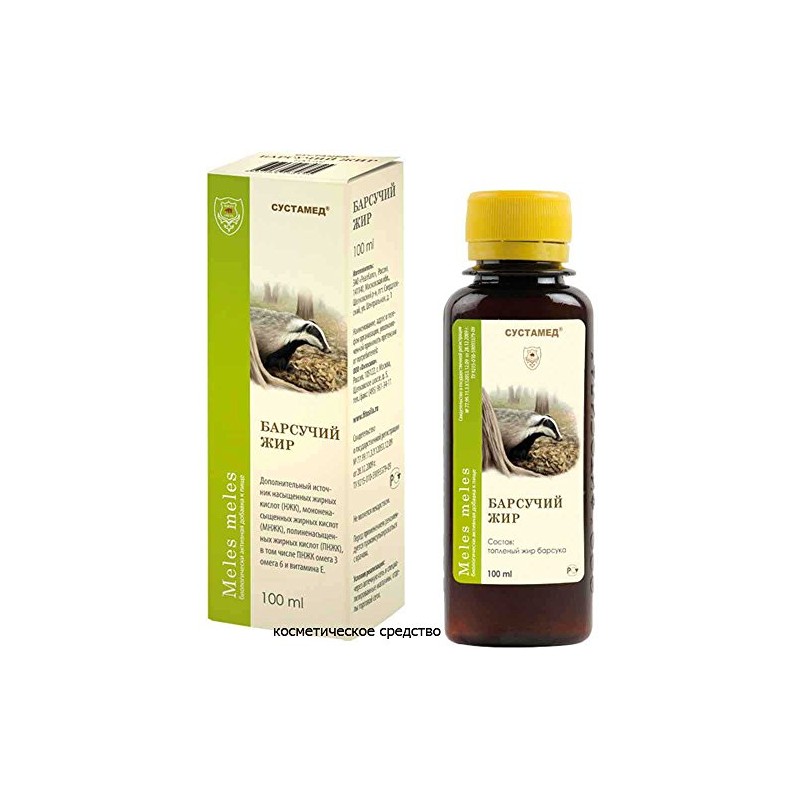 - Badger fat, badger fat, marmot fat 100 ml. Ingredients: badger fat 100%. The recommended daily amount of 20 g contains: proteins - 0.12 g; fat 19.88 g; vitamin: A - 46.6 mg, D - 4.0 mg, E - 0.062 mg: energy, calorie content at daily amount - 20 r 179 kcal / 752 kJ. Unsaturated fatty acids 80.5% saturated fatty acids -18.9% recommended daily protein 0.05 g fats - 7.95 vitamin D - 16 mg, vitamin E - 0.025 mg
