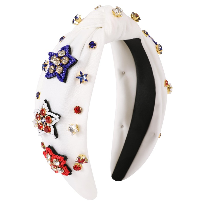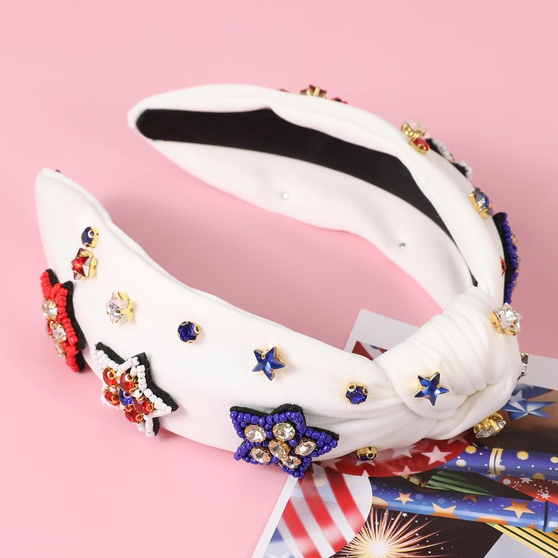 - Fourth of July Headband: Looking for an unique way to showcase your love and passion for the USA? Feast your eyes on this American Flag Headband! Embellished with red, white and blue rhinestones, stars, American flags, USA letters, bows, and heart charms, this jeweled headband is the ideal hair accessory for patriotic enthusiasts. Designed with a stylish wide knot top, all the accents are hand-made and securely glued on the headband, adding a touch of glamour to your hair on Independence day