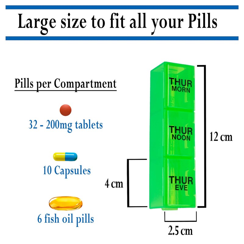• » ORGANIZED - With seven daily pill boxes and three compartments per day, you can organize a weeks worth of medication by day and time! Each day is marked with three times (Morn, Noon, Eve) so you can organize your pills by time. With bold labels and colors, you can easily keep track of your medications, vitamins, supplements, and other pills.