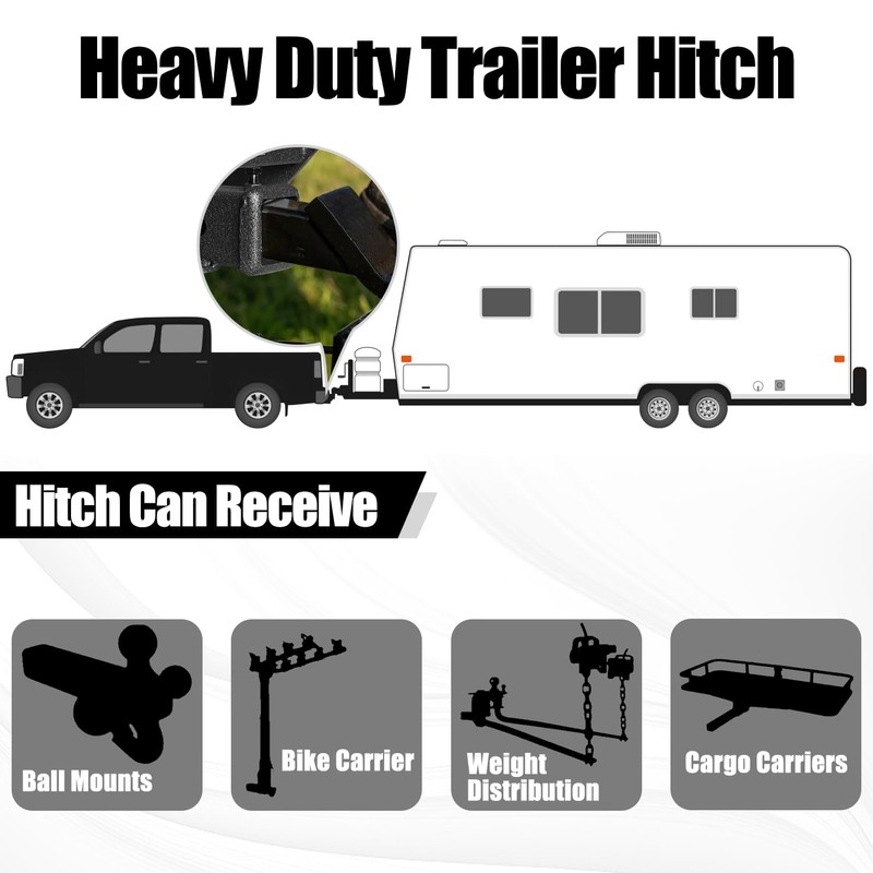 - 【Design】High Hardness Trailer Hitch equips your vehicle with a standard 2" x 2" hitch receiver, offering a variety of towing options such as ball mounts, cargo racks, bike racks, tow hitches and more.
