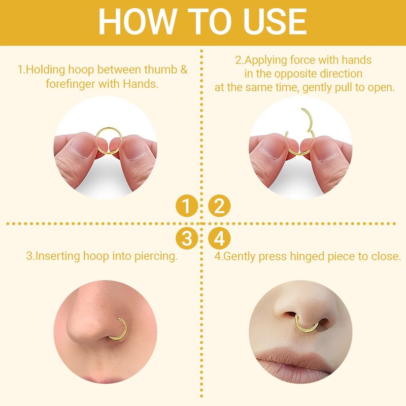 - Body Piercing Creolen: Sie erhalten 8 Nasenringe für die meisten Piercings, die als Nasenlöcher, Septum-Piercingschmuck, Knorpelreifen, Spiralpiercings, Turmpiercings, Dais-Ohrringe, Muschel-Piercingschmuck verwendet werden können