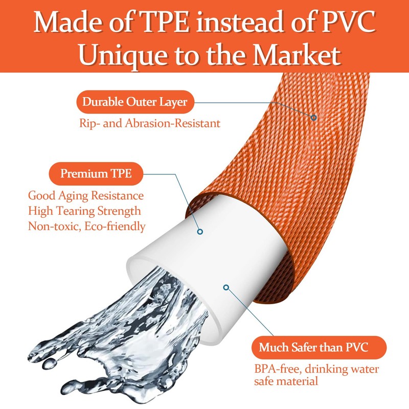 - [ All-Weather Flexibility ] Maintains flexibility down to -22 degrees Fahrenheit and can be used in temperatures up to 150 degrees Fahrenheit. Ordinary PVC hose has poor-resistance to low and high temperatures, and the hose loses performance under temperature changes, which can damage it. TPE's superior freeze-resistance provides durability to the hose.