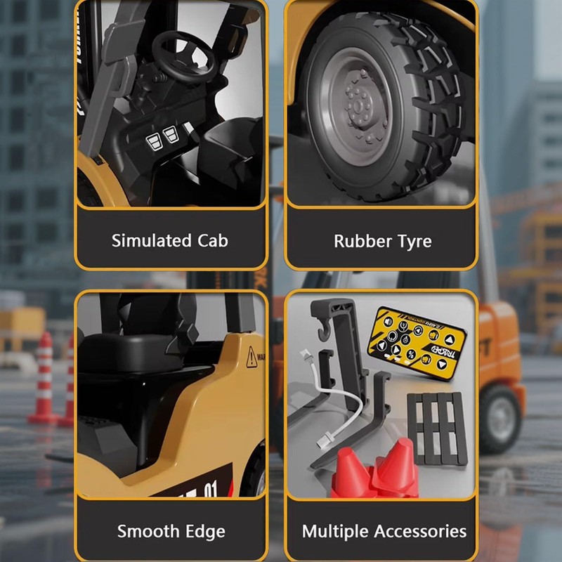 - Exquisite Craftsmanship—The RC forklift crane toy features a metal frame structure that combines load-bearing capacity with durability, showcasing exceptional attention to detail. Its metal body undergoes an electrostatic spraying process, resulting in a scratch-resistant, smooth finish. Meticulously scaled to perfectly replicate the appearance of a real forklift, it stands as an ideal choice for both collectors and as a perfect gift.