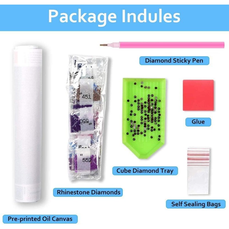 - 5D Diamond Painting Kits for Adults:Each diamond painting comes with all tools in need. Following tools are Included: 1*HD painting canvas, 1*diamond pen, 1*cube diamond tray, 1*red glue clay , , 5*plastic bags for putting diamonds, and enough colorful round diamonds. For each kit we'll provide 30% diamond more than need,You don't have to worry about not having enough diamonds