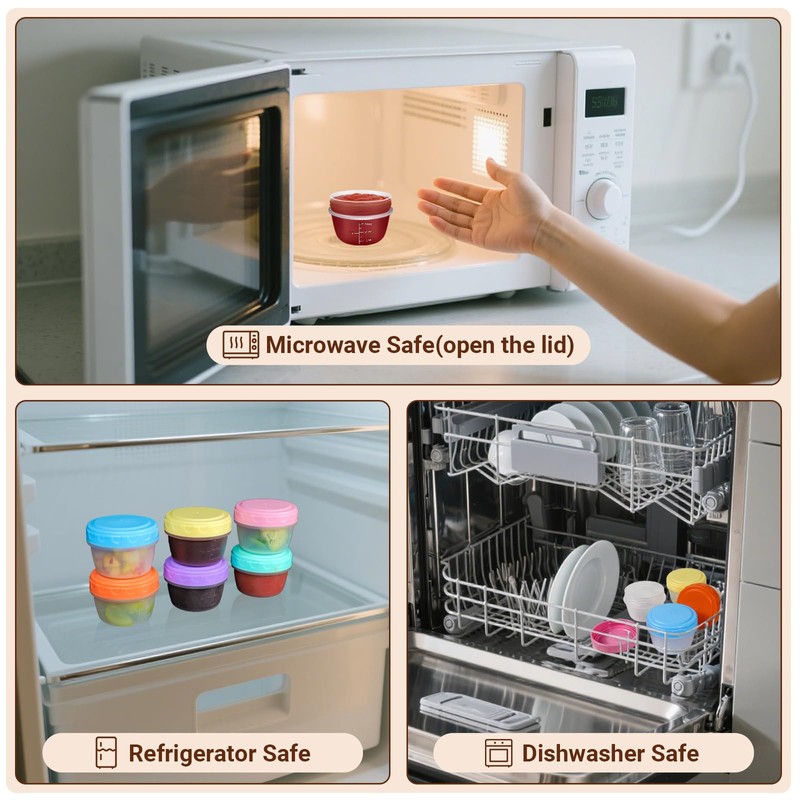 - MICROWAVE,DISHWASHER AND REFRIGERATOR SAFE : These sauce cups are made of food-grade PP-5 material,The temperature range for use is -4 to 248 ℉.Sauce cups can be placed in the microwave or oven, but please note that the lid needs to be removed.We do not recommend more than 3 minutes.They can be cleaned in a dishwasher (placed on the top rack) It can also be placed in the refrigerator.