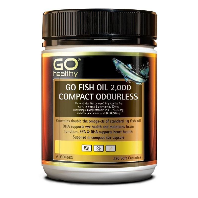 Go Healthy Go Fish Oil 2,000 Compact Odourless SoftGel Capsules are easy to swallow compact capsule with double the omega-3s of standard fish oil which supports cardiovascular health and brain function, and is for joint health and comfort.