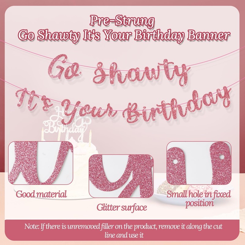 - Combination Packaging: You will receive an already strung rose gold glitter banner with the letters "Go Shawty It's Your Birthday", use our banner to add beauty, create a good atmosphere, make it eye-catching and impress guests