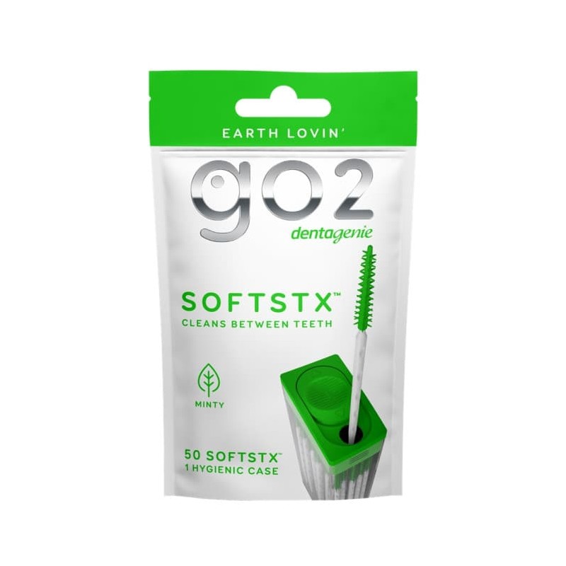 GO2 Dentagenie Softstx - Cleans between Teeth. Earth Lovin'. Minty flavour. 50 Softstx, 1 Hygienic Case for convenience on-the-go GO2 DENTAGENIE SOFTSTX - Cleans Between Teeth. EARTH LOVIN' recyclable plastic case and packaging SUPER SOFT FLEXIBLE BRISTLES gently removes food and plaque … peace out! FIRM TEXTURED TOOTHPICK safely and easily stimulates gums … very cool! COMFY GRIP feels great. REFILLABLE HYGIENIC CASE keep em' clean and fresh on-the-go.