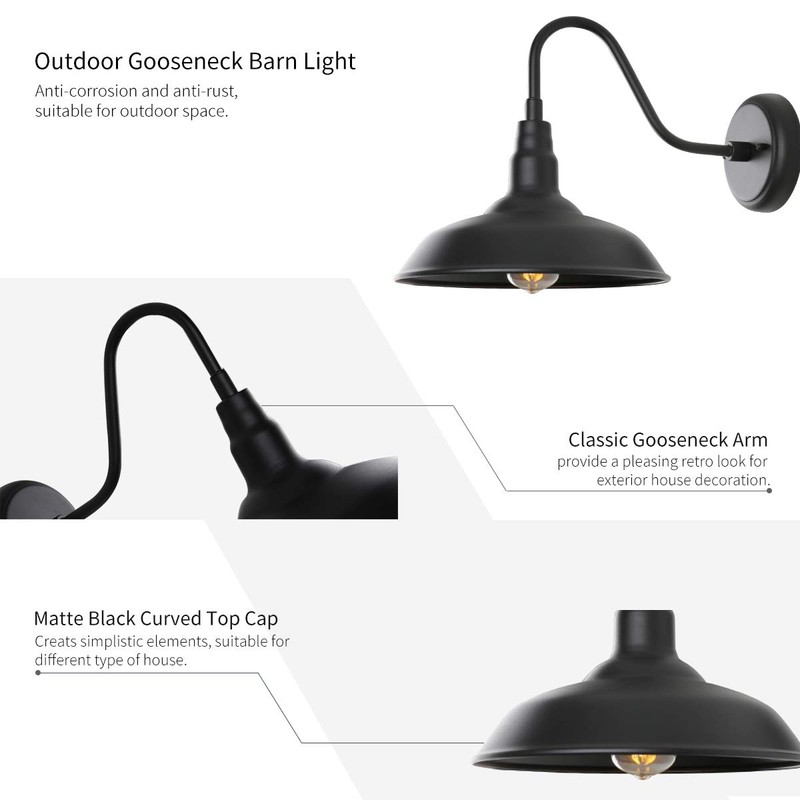 - 【Classic Outdoor Light Fixture Makes Your House Look Unique Stylish】 - Featured with its retro gooseneck arm and simple 14 inch dome design, finished by a high-tech matte black powder coating process, this barn style wall sconce brings a pleasing and simplistc elements to both exterior and interior place. The open bulb area of this sconce also spreads the light farther, meets the illumination needs for your farmhouse, cabin, garage, doorway, garden, porch, yard, garden, front and back porch.