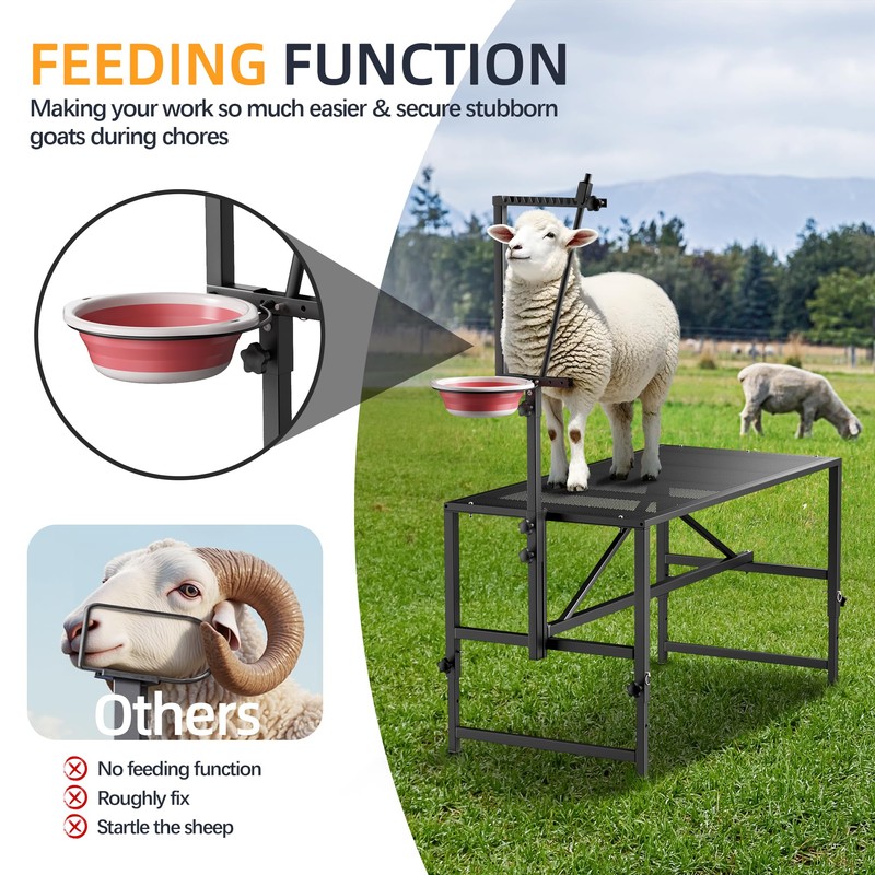 • [ Heavy-Duty and Spacious ] With a tabletop measuring 47x23 inch and a weight capacity of up to 600 lbs, our goat trimming stand is perfect for animals of various weights. An adjustable metal headpiece secures animal heads, facilitating trimming, health checks, and grooming tasks.The stable triangular frame design makes the sheep rack very sturdy and stable