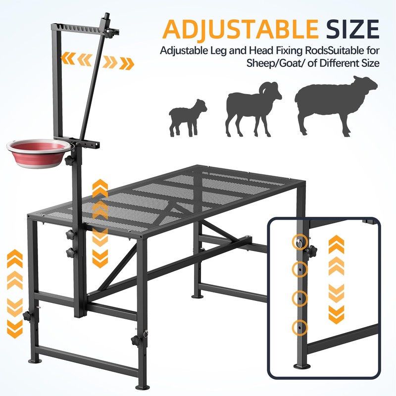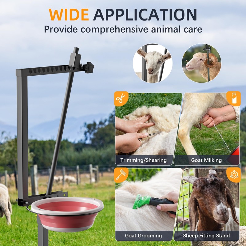 • [ Adjustable Goat Stand ] Adjustable design of the goat trimming stand, adjustable Height 44.5" to 67.8" Sturdy Sheep Standmakes it easy to use for different sheep. You could easily adjust the height of leg and head pole based on the height of the sheep; What's more, it's easy to adjust the space for fixing the head according to the size of the sheep's head
