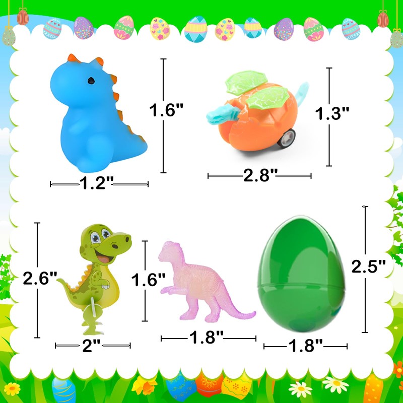 What you will receive is a total of 58 pieces dino themed small toys: 4*dinosaur squish toys, 6*mini dinosaur figures, 6*rings,4*keychains, 10*stampers, 3*egg cars, 4*eggs, 6*slap bracelets, 10*puzzles, 5*glow in the dark tattoo stickers.