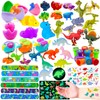 - Assorted Party Favors: Package comes in a large assortment of dinosaur themed toys: squishy, mini dinosaur figures, rings, keychains, stampers, egg cars, slap bracelets, puzzles, glow in the dark tattoo stickers, and dino eggs