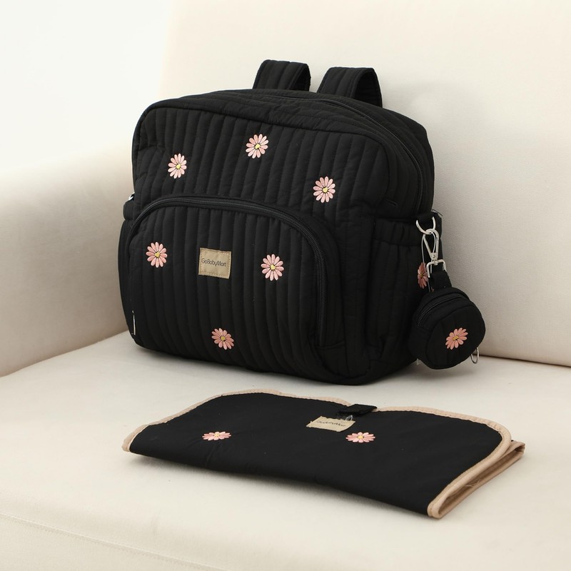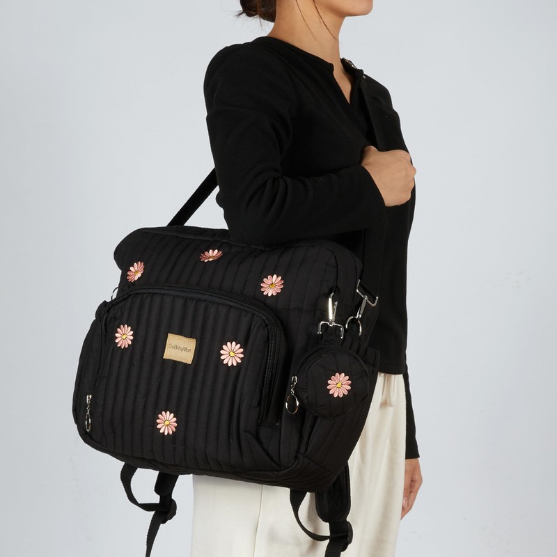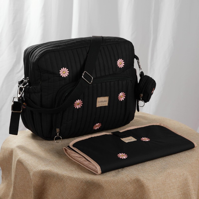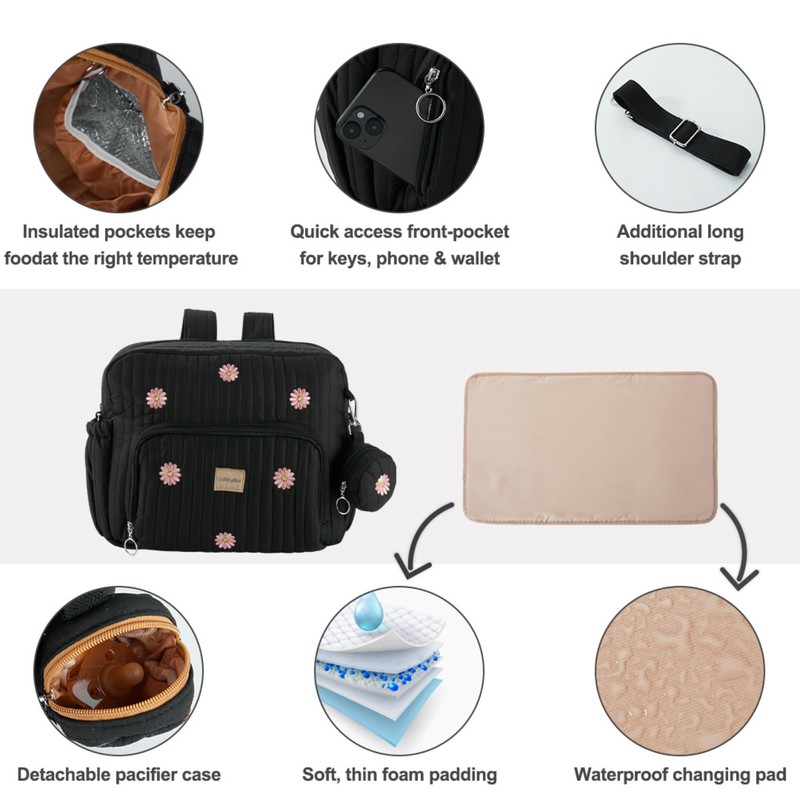 GOBABYMART Diaper Bag Backpack, Medium Maternity baby bag & Changing Pad, Insulated Pockets, Stroller Straps & Pacifier Case (Medium - Black Flowers)