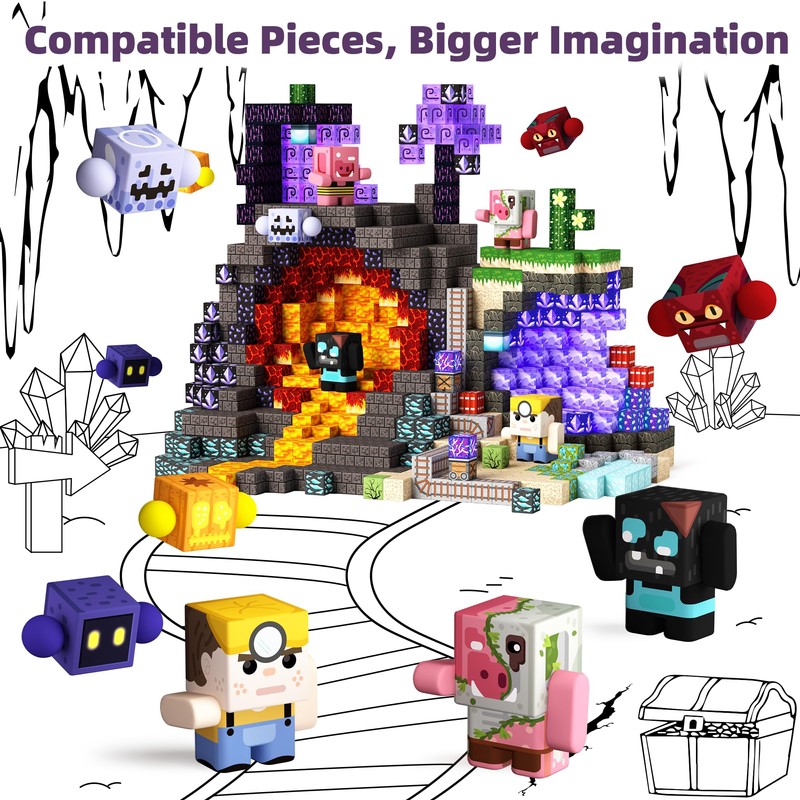 - Block-style Creatures Set: 8 magnetic action figures with cave discoverer, night protector, forestland dwellers. Perfectly suited for expanding magnetic block-based worlds, allowing kids to create immersive mining expeditions or forestland adventures