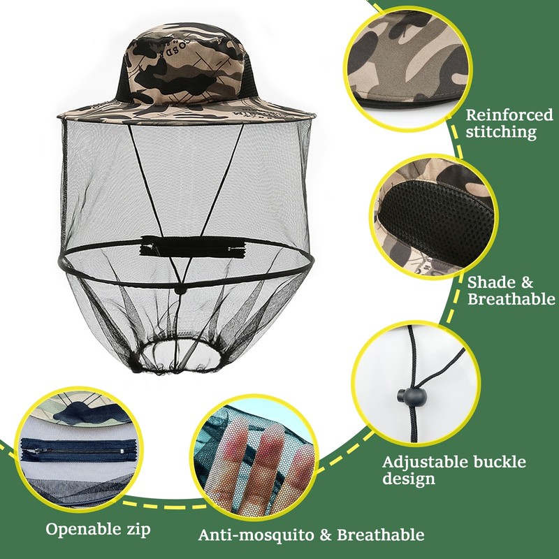DescriptionMosquito Hat with Removable Netting Mosquito Head Net Sun Hat Quick Dry Wide Brim Sun Protection for Outdoor Hiking Camping Gardening Fishing