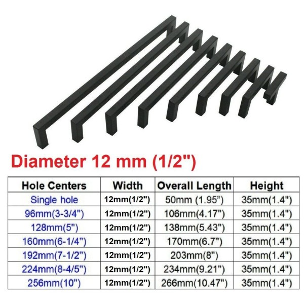 Gobrico 12mm 1/2" Black Kitchen Square Cabinet Handles Drawer Pull Knobs Stainless Steel - 192mm (7.5")